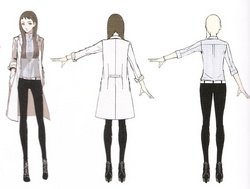 平日穿着白色风衣、浅蓝色衬衫、白色条纹和黑色牛仔裤,搭配黑色高跟皮靴。