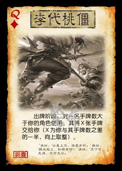 作用效果:目标对应的角色交给你X张手牌(X=[(其手牌数-你的手牌数+1)/2])。