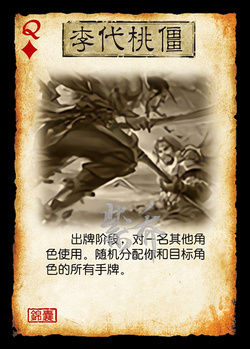 出牌阶段,对一名其他角色使用。随机分配你和目标角色的所有手牌。