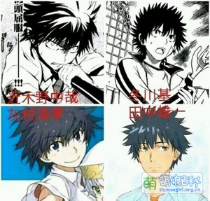 如图,左上角为《魔法禁书目录》的漫画,而右上角则为漫画《某科学的超电磁炮》; 左下角是小说《魔法禁书目录》的插画,右下角便是田中雄一的动画人设的上条当麻。