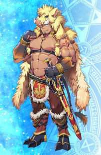 | 萌点 | 武士刀、武士、人造人、兄贵、上梳刘海、黑色皮肤、渐变色发、金发碧眼、虎牙、伤疤、兽皮装、无上装、手镯、尾巴、纹身、拖鞋、报恩、忠犬、动物足、快递员 |