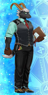 来自异世界“世界树”,拥有纯黑毛发的山羊兽人“转光生”。在原本的世界里拉过战车,如今则因此经验在圣诞老人学校的驯鹿科执教。成为教师的时日尚浅,对于“教育”一事还有很多不习惯的地方。本人虽然还想继续担任教师,但由于脚上有无法痊愈的伤,便从一线退下。曾侍奉的主人是位非凡的豪杰,因此他的性格多多少少受其影响,有些暴躁,只要血气上来了就会忘记身上所有的伤,不顾一切地行动起来,从而导致旧伤复发。自从成为了教师,他也开始注意起自己的语气,自认为是在“理性的行动”,然而旁人眼里,他依然直来直去,最近有学生向他指出这个问题,他有些在意。