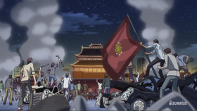 为了阻止大宦官与使团的见面,留在首都洛阳的红巾党依靠大口径列车炮“望天吼”与联邦量产型KMF“钢髅”的炮击强化型策划了一场针对大宦官与修奈杰尔的斩首行动。但是因为机体性能问题被帝国使团随行的“大格林达骑士团”镇压。