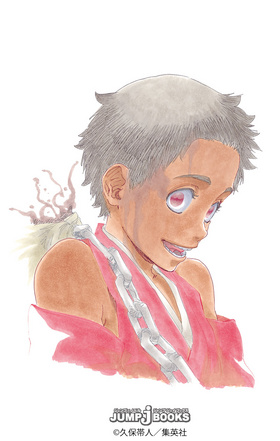 - 黑色短发,皮肤黝黑的小孩子,身着红色的短袖和服,背着一把巨大的斩魄刀。