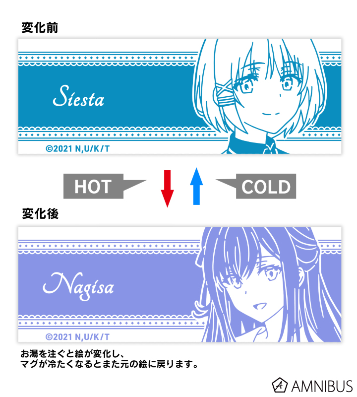 官方联合周边品牌AMNIBUS推出了一款变色马克杯[3]。马克杯使用对温度敏感的特殊墨水,在倒入热饮料时图案会从谢丝塔变为夏凪渚。官方剧透,最为致命。