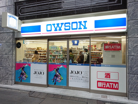 便利店与ACG作品联动的例子屡见不鲜,其中日本的便利店品牌中,又以LAWSON在动画企划方面最为积极,曾与包括新海诚、细田守导演的作品在内的数十部动画联动。在一些比较大型的企划中,就连店铺本身也会被装扮为作品中的模样。例如,LAWSON曾多次与《JOJO的奇妙冒险》推出联动企划,在活动期间先后把位于仙台(作品舞台杜王町的原型)[14]、长崎[15]、东京[16]的门店修改为作品中“OWSON”的样子,同时店内贩售购物袋、衬衫、手办等多款OWSON或作品主题周边产品。