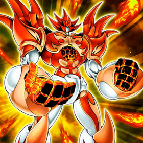 - 融合:「元素英雄 炽热侠」+「元素英雄 火焰女郎」。这只怪兽不能作融合召唤以外的特殊召唤。和水属性怪兽战斗的场合,伤害步骤内这只怪兽的攻击力上升1000。
