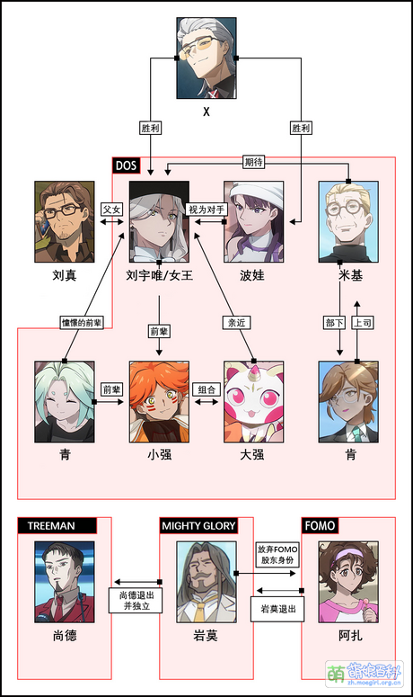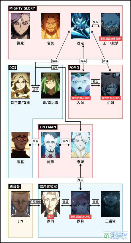 | | | | 登场人物 | | Top10 | | | | TREEMAN | 奈斯 • 林凌 • 潇月卿 • 破坏王 • 不倒 • 忘仔 • 娟姐 • 尚德 | | | MIGHTY GLORY | 梁龙 • 默杀(退出) • 魂电 • 阿生 • 旋涡 • 岩莫 • 尚德(退出) • 尚实 | | | DOS | | | | FOMO | | | | 微光实验室 | | | | 联合会 | JIN | | | 探照灯 | 刘真 • 启士/天眼 • 狂欢 | | | 福利院 | | | | 其他 | 程咬金 • 蛊狼 • 夏晴 • 尚超 • 小柚子 • 张兰 • 阿秋 • 干柴烈火 • 微笑 |