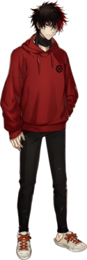 黑发加上红色渐变发,眼神凶恶,看上去似乎并不是容易相处的类型。嗯?莫非你是他的弟弟