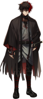 刺客般的着装,还留有血迹,脖子被长长的绷带绕了好几圈,为了掩盖脖子上原来因为断刀而造成的伤疤,其前主也因斩首而死,给歌仙一种看着就想给他洗衣服的感觉。内番和出阵穿的同一条裤子。