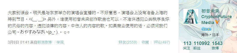 另外,在2012年1月29日时由日本的网络用户在2ch及YouTube上发起了SaveMiku活动,并在2月1日被翻译成各国语言发布到世界各地。不过被部分知名初音未来歌曲作者批评为是支持任意转载活动。