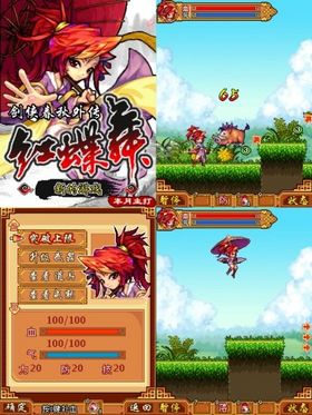 游戏中,玩家操控女主角红蝶与敌人作战,红蝶有红色的血量和蓝色的气值,还有力、防、技三种属性。