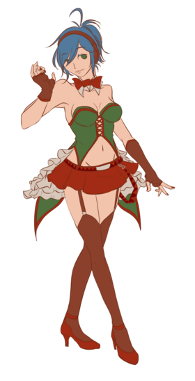 身穿绿色紧身胸衣和红色迷你裙,白色带有红色领结的假领,黑色吊袜带过膝长袜和红色一带高跟鞋。
