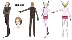 安吾有达到下巴长度的铜色头发,鼻子的左侧有一颗痣。有细眉毛和窄棕色的眼睛。
