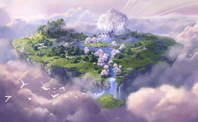 家园是一座位于云海之上的心形浮空岛,面积约90000平方米,一条河流贯穿其中。