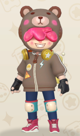 - 在简单和普通模式穿着小熊服装。其中简单模式下露出了粉色的头发,普通模式则被高科技墨镜挡着眼部。在这两个模式下背着像游戏机一样的设备,并且穿着护膝。