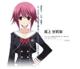 尾上世莉架是5pb游戏公司制作的科学ADV系列第4弹作品《混沌之子》中的女主角之一。碧朋学园高中二年级新闻部所属,宫代拓留的幼驯染,称呼他为“タク”(阿拓),拥有一点不用被担心的性格以及和拓留不一样的社交性,在学园里有很多的朋友。