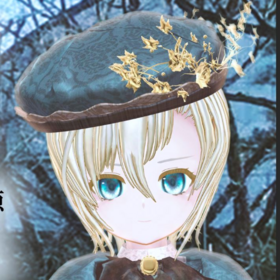 - 届木羽华4.0+:发色浅蓝,贝雷帽上挂着蝴蝶结连接蓝色头带。
