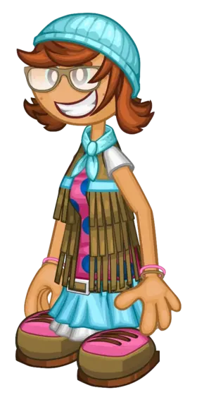 帕莉有一头橙色的短发和晒黑的皮肤。她穿着一件带有深蓝色波点和白色袖子的粉红色短袖衬衫,下穿一件顶部有蓝色条纹的浅棕色流苏背心,以及一件白色底层和绿松石顶层由浅棕色保持的双层裙子带白色搭扣的铆钉腰带。她还戴着浅蓝色的围巾和骷髅帽,浅棕色的眼镜,手臂上的浅棕色和粉色手镯,棕色和粉色的莫卡辛鞋,鞋底和鞋带为深棕色。