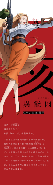拥有三百年以上历史名家的后嗣之女。使用的武器是双手所持的机关枪“爱终”和“命恋”。精通重火器的使用,无论多么厚重的兵器都能自在地操控,但其中这两挺枪对于她而言则犹如与自己相连的肉体的一部分。现在与十二名男性进行着健全的交往,在此之上还在募集恋人当中。