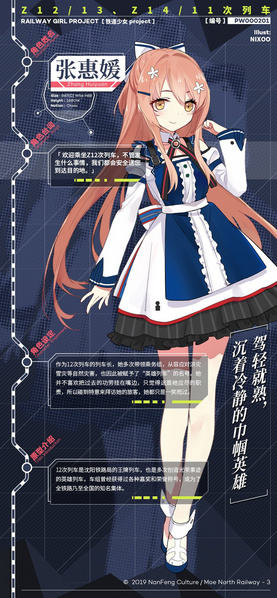 张惠媛是北方铁道萌化部原创并发行的设定集《铁道少女project:旅客列车篇》中,中国国铁Z12/13/14/11次列车的拟人化萌娘。[1][2]
