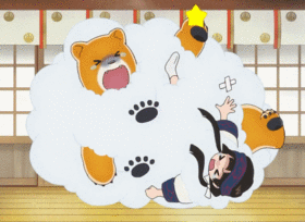 该画法多见于日常番等气氛轻松愉悦的动画/漫画中。表现为两个或多个角色打架时,画面被尘土笼罩,就像一个封闭的团子,随机位置伸出四肢与头颅,杂物乱飞。由于其起源甚早,第一部采用此种画法的动画/漫画已然不可考。