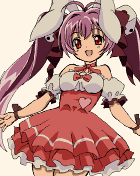 粉色的用骰子发饰束起的双马尾以及特大的兔耳是其显著特征,穿有粉色的女仆连衣裙风服装。