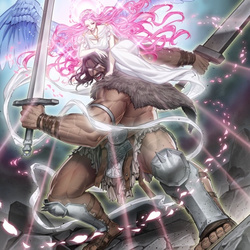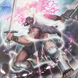 - 卡图描绘了一位挥舞双巨剑的战士,身旁依偎着散发荧光、背生双翼的女神。