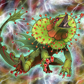 - 原型为利用「茅膏菜属」植物和「伞蜥(Chlamydosaurus kingii)」的缝合生物,属于捕食植物的卡组特色。
