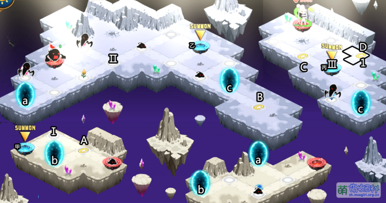 - 第2天,根据具体情况,可以选择:①套餐乙进入传送门a,将右下浮空岛上的渣滓净化(行动点必然足够)。②如果传送门c旁边那个渣滓穿过传送门,可以考虑让套餐丙将其净化掉。