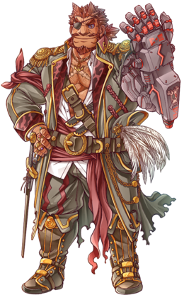 | 萌点 | 义手、大叔、刺猬头、眼罩、褐色皮肤、黑白目、披风、项链、海盗、伤疤、开胸高领衫 |