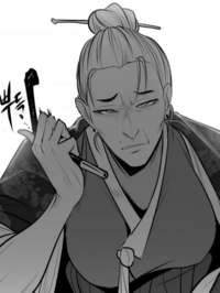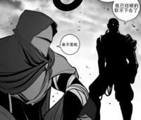第22话,在得知有人可以折断甲角龙的角后,鬼头武士兴奋地喷出了奇怪的液体。 第24话,鬼头武士无视魔王欧铂的命令,只身一人来到了波洛利村[39]。 第25话,鬼头武士绑架了波洛利村主席,当着全村人的面扒掉了她的上衣。随后,与当时在村中担任护卫的青展开了战斗。鬼头武士对青的实力感到十分兴奋,为了表示感谢主动变身为半勃状态。之后,董白加入了战场,终于毫无顾忌的青施展了“玉石俱焚”将鬼头武士打败。正当二人以为胜利的时候,鬼头武士突然迎着晨光站了起来,但随着魔王欧铂的出现中止了这次战斗,随后鬼头武士被欧铂秒杀拖了回去。 第35话,鬼头武士自称向欧铂保证不下杀手的前提而被允许继续上次的战斗。尽管青在之前因为 第37话,鬼头武士被青一行人设计杀死,青施展“玉石俱焚”引导鬼头武士到指定地点,慧珍将之前得到的蛇皮套在了鬼头武士的头上,最后由春子完成斩杀。 第38话,鬼头武士的头颅被寄给了春德,得知大仇已报的春德激动地流下了泪水。 第44话,鬼头武士不知为何神奇般地复活了,春心重伤,春德不省人事。 第45话,洛姮潜入唤醒了鬼头武士,以复活为条件,希望鬼头武士可以为自己做事。于是,鬼头武士接受了条件,同时脖子上也多了一道缝合的痕迹。随后,鬼头武士随洛姮回到了藏身处,尽管与蒙面人们相处的并不愉快,但鬼头武士表示还是想看到洛姮会做到什么程度。与洛姮对话时,他也得知了青的身世的始末。 第50话,鬼头武士短暂出现在善律与董白的附近。 第54话,鬼头武士再次出现在青一行人的面前。 第55话,鬼头武士掏出春德的眼球挑衅,致使春子战意动摇。鬼头武士这一次袭击的目的是捉住青在洛姮的面前故意羞辱她。尽管知道自己一定会再死一次,但鬼头武士还是打算为自己的信念而战[40]。突然,鬼头武士打了个冷颤,察觉到似乎有一个强大的存在在附近。 第56话,在回忆中得知,鬼头武士在与豪斯的战斗中一败涂地。尽管在欧铂、洛姮这样的强者面前他还是非常嚣张,但在豪斯面前却被吓得连连后退。豪斯表示对他的功能性并没有兴趣。在嘲笑了他的名字后,很认真地询问了他是不是还有一个亲戚。鬼头武士暴怒却又被豪斯按在了地上。豪斯觉得无趣,于是掏出了 第57话,遭受致命伤的鬼头武士打算将青的身世全部抖出来,正当说到父亲下落的时候,被洛姮在远处以魔法杀死。 第104话,蒙面人首领使用豪斯之剑将鬼头武士召唤了出来[41]。 第105话,跟不上版本的鬼头武士眼看不敌春德、梅花二人,打算将春子捉为人质。但他不知道春子这段时间已经是人类里最强的存在了,瞬间就败下阵来。最后在春德、梅花二人的拳打脚踢下悲情退场。 顺便一提,暗黑骑士在第一次死亡时,看到了鬼头武士在河对面招手。 |