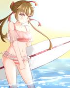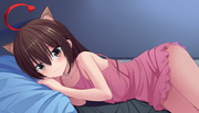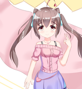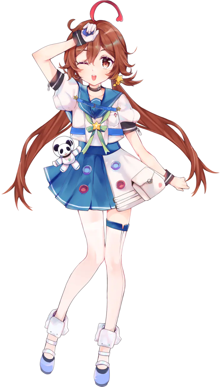 - 褐色瞳,编着天蓝色糖果一般的发饰。发型为咖啡色双马尾、头顶鲜红色