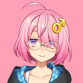 穿着黑色卫衣,但帽子内则是蓝色的,粉红色的头发更为深色,有呆毛的存在,左额上有「♂」符号头饰。