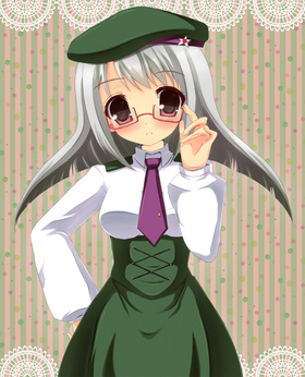 铃原ミヤコ创作的旭川娘,拥有一头银色的长发,戴着眼镜和拿着一本书,帽子有旭川市市章的标志。
