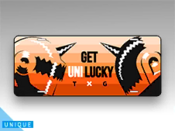 法国电子乐队Daft PunK(蠢朋克乐队) | 饰牌上的文字GET UNILUCKY来自Daft PunK的歌名《GET LUCKY》,配色为该曲的封面配色,而饰牌描述亦为该歌曲中一句歌词的翻改 饰牌上的小字T×G分别代表Daft PunK的两名成员Thomas Bangalter和Guy-Manuel de Homem-Christo 饰牌上的两个头盔形象来自Daft PunK以机器人扮相示人时的模样 |