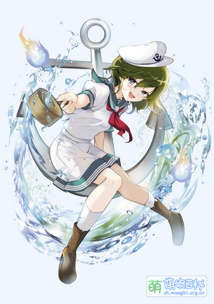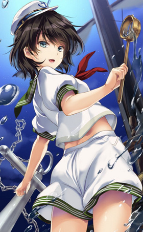 黑色头发、湖绿色的眼睛。穿着一身白青相间的水手服,戴水手帽,打红色领带。另外还右手握着一支舀子,左手托着一枚巨大的船锚。