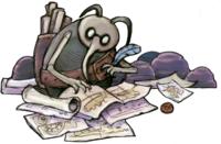 - ↑ 3.0 3.1 《漫游者日志》:A travelling cartographter of sorts, this interesting character knows the lie of the land better than any other bug alive; his mapmaking obsession constantly drives him deeper and deeper into the kingdom. On those rare occasions when he isn't out exploring and charting Hallownest's depths, he can usually be found in his shop in Dirtmouth with his wife, Iselda.