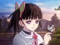 于炭治郎等人在蝴蝶屋休养时协助进行机能恢复训练,为炭治郎的进步之快稍感震惊,在炭治郎完成训练后向香奈乎道别,并且以掷硬币为赌注,希望香奈乎能依照自己的意志行动,对于炭治郎的举动感到惊讶,在炭治郎的影响下也慢慢改变。