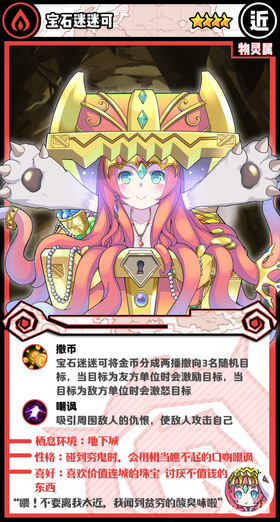 宝石迷迷可将金币分2/3/3拨撒向3/3/4名随机目标,当目标为友方单位时会激励目标,获得20%攻击力提升2秒,当目标为敌方单位会激怒目标,吸引仇恨2秒,并造成90/110/130%伤害。