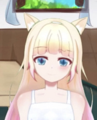 发色为橙色,用粉色挑染,头上有一对橙色的猫耳,猫瞳的颜色为蓝色,右眼有一个稍微透明的红色十字架。身着白色太阳裙,欧派比初代形象大,右手系着橙色带子,裸足。下半身并没有画。