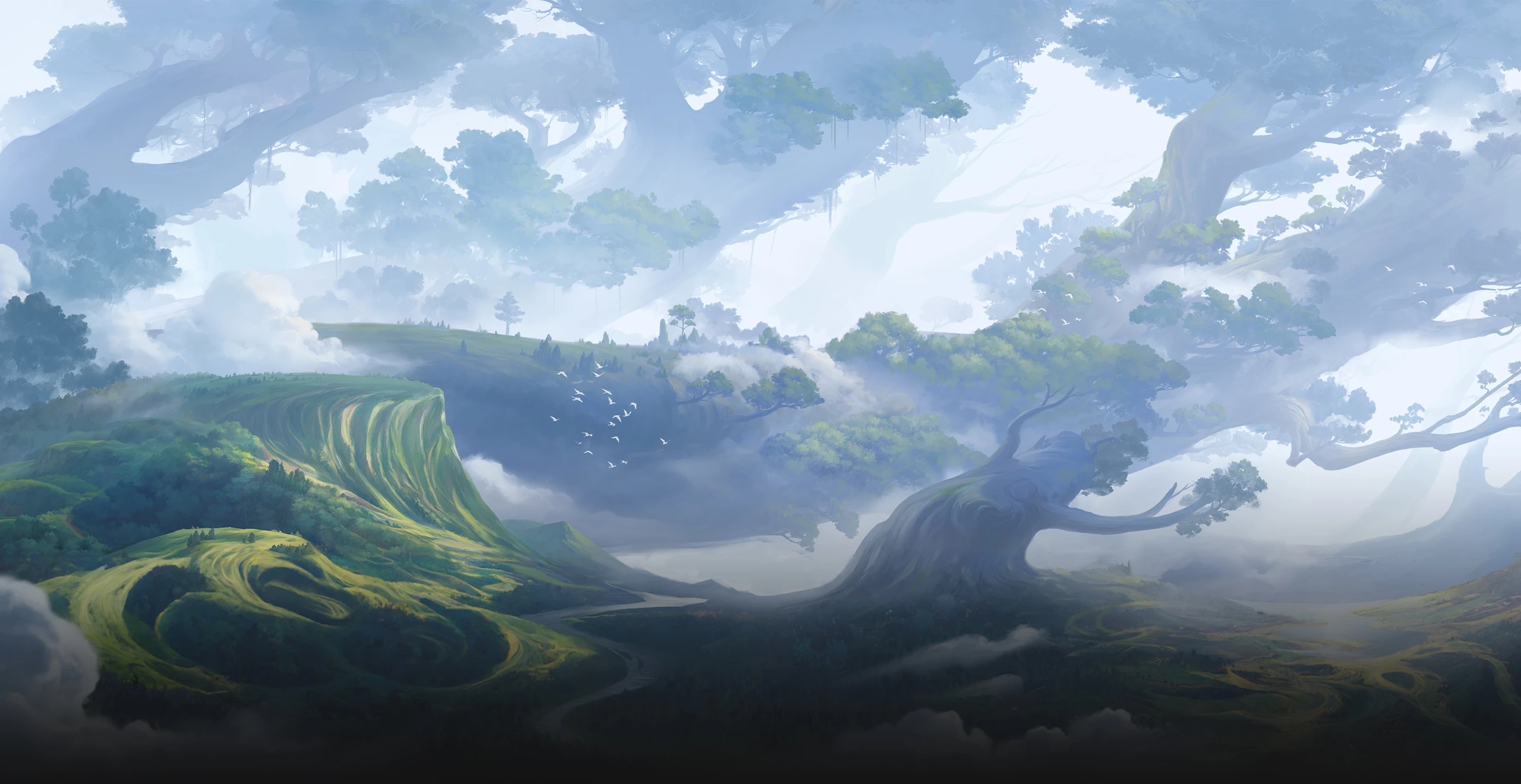 云梦泽的湖泊都“生长”在树冠上或巨枝交错处,林间的积水常从高处坠下,形成瀑布。百景森林中有大量湖泊聚集的大湖区,其中最大的一处达到200平方公里。大湖区周边的森林分布相对稀疏,森民们大多围绕湖畔居住。