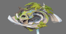 忘忧沼泽,位于天生木中段的无底之水,森林的核心位置,森民告别逝者之地。森民的祖先从生命之花中诞生,他们认为,死去的魂灵只有回到母树才能获得宁静。千年以来,森民们将逝者的遗体送来此处,用出生时给予他们祝福的生命之花花瓣和枯叶制成往生船,载着逝者,缓缓驶入沼泽。