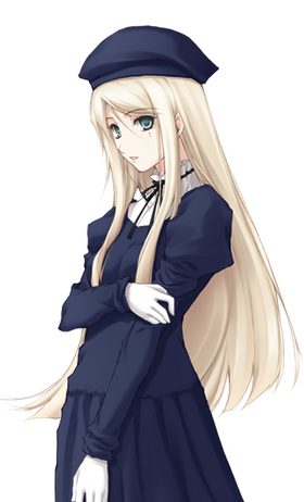 身材纤细,皮肤白皙。金发碧眼,有两颗泪痣。深蓝色贝雷帽和长裙,戴着手套。
