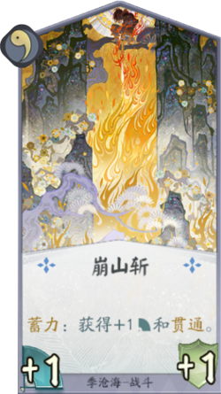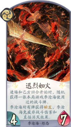 武艺天赋极高的季沧海,在牌局之上也有着极强的进攻性与压制力。季沧海是一位具备「蓄力」能力的角色,当季沧海处于「蓄力」状态时,将获得额外的力量值加成。季沧海的基础能力,配合其自身卡牌的「蓄力」效果,能够向对手发动如燎原劲火般的攻势。