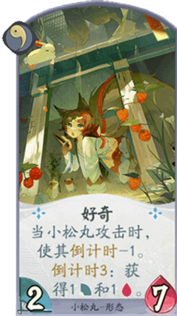 小松丸是具有「运势」与「倒计时」能力的式神。「倒计时」会带来增益效果,「运势」判定成功则会加速获得这些增益。小松丸可以利用不同的卡牌,获得身材加成、免疫战斗伤害、无伤站场或解场能力等各种效果。