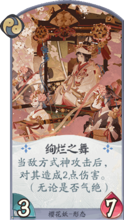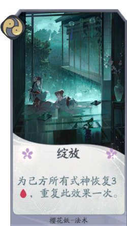 樱花妖是一个辅助型式神,能够通过对气绝式神进行治疗/伤害,加速或延迟其复活。