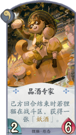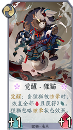 狸猫在被「眩晕」时,可以为自身恢复生命值并得到力量值加成。狸猫能够配合其自身卡牌效果,获得「妖酒」并以此进行多种「眩晕」操作。灵活运用「妖酒」能使狸猫具备更强大的控场与站场能力。