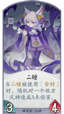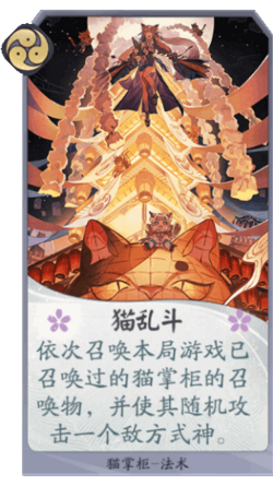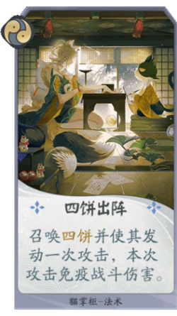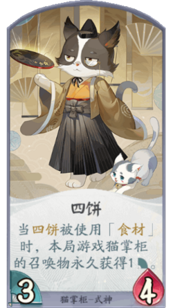 作为猫又亭的老板娘,猫掌柜在百闻牌对局中可以召唤「一条」、「二瞳」、「四饼」三位猫侍应共同作战。每当猫掌柜的召唤物入场时,将随机对其使用一张「食材」。不同召唤物被使用「食材」时,可以获得不同的额外增益效果。通过灵活运用「食材」与召唤物的配合,猫掌柜能够对敌方连续发起大量进攻。