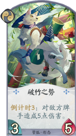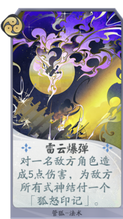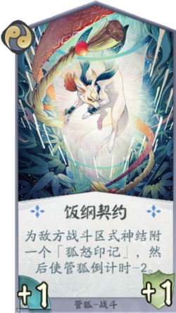 管狐在对局中主要通过为敌方式神结附灵咒「狐怒印记」,与触发自身的倒计时效果来展开,能够周期性地对敌方造成伤害。配合管狐的其他卡牌,可以进一步扩大「狐怒印记」的结附范围,为在短时间内对敌方队伍造成巨额爆发伤害提供条件。